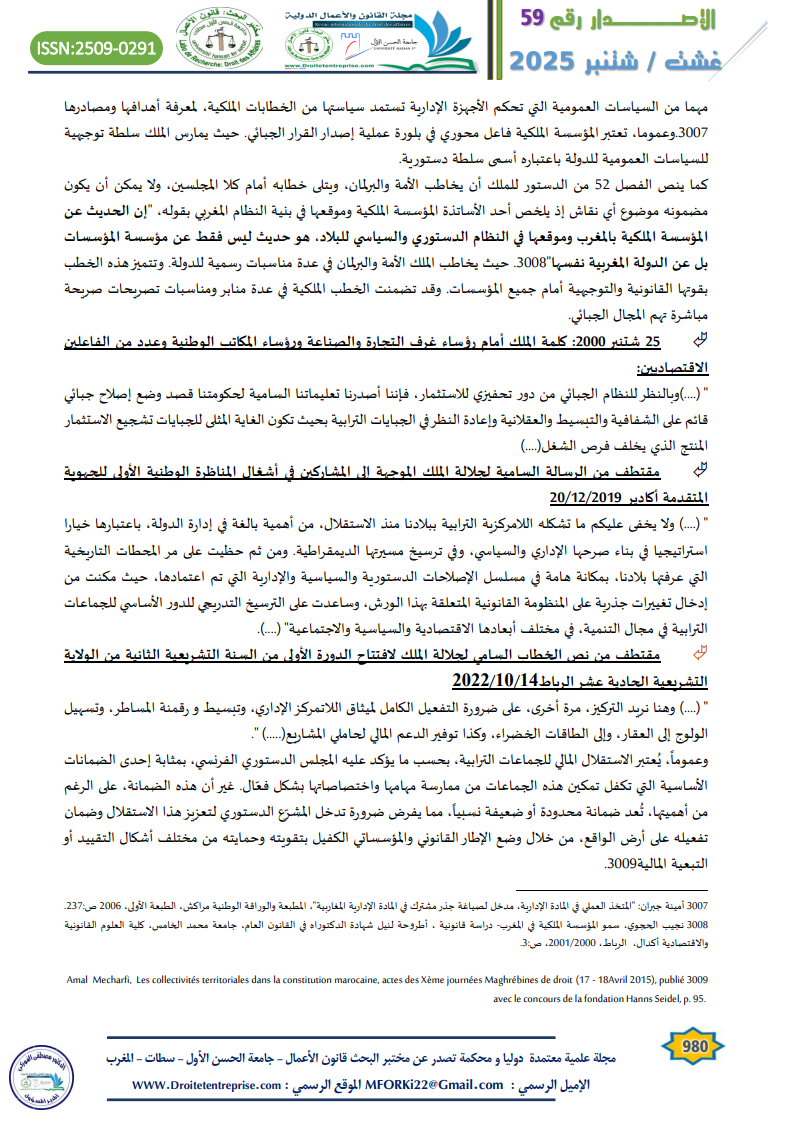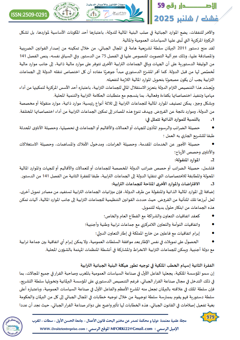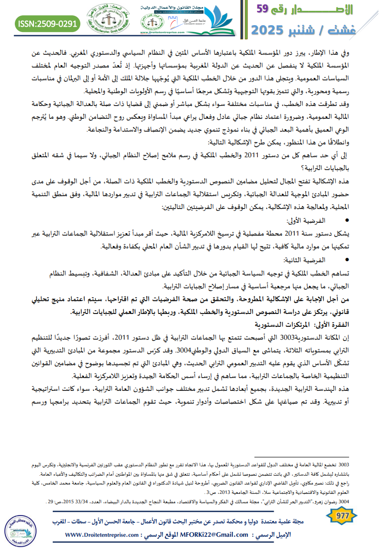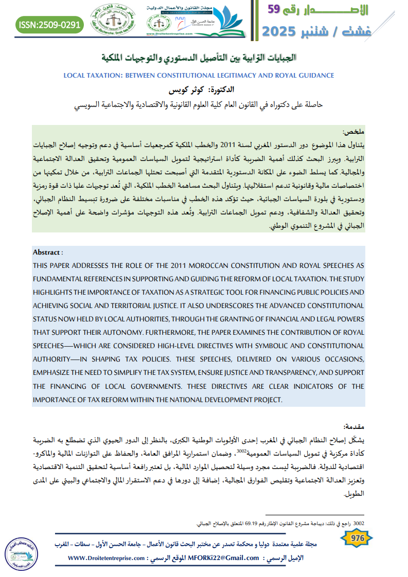 THIS PAPER ADDRESSES THE ROLE OF THE 2011 MOROCCAN CONSTITUTION AND ROYAL SPEECHES AS FUNDAMENTAL REFERENCES IN SUPPORTING AND GUIDING THE REFORM OF LOCAL TAXATION. THE STUDY HIGHLIGHTS THE IMPORTANCE OF TAXATION AS A STRATEGIC TOOL FOR FINANCING PUBLIC POLICIES AND ACHIEVING SOCIAL AND TERRITORIAL JUSTICE. IT ALSO UNDERSCORES THE ADVANCED CONSTITUTIONAL STATUS NOW HELD BY LOCAL AUTHORITIES, THROUGH THE GRANTING OF FINANCIAL AND LEGAL POWERS THAT SUPPORT THEIR AUTONOMY. FURTHERMORE, THE PAPER EXAMINES THE CONTRIBUTION OF ROYAL SPEECHES—WHICH ARE CONSIDERED HIGH-LEVEL DIRECTIVES WITH SYMBOLIC AND CONSTITUTIONAL AUTHORITY—IN SHAPING TAX POLICIES. THESE SPEECHES, DELIVERED ON VARIOUS OCCASIONS, EMPHASIZE THE NEED TO SIMPLIFY THE TAX SYSTEM, ENSURE JUSTICE AND TRANSPARENCY, AND SUPPORT THE FINANCING OF LOCAL GOVERNMENTS. THESE DIRECTIVES ARE CLEAR INDICATORS OF THE IMPORTANCE OF TAX REFORM WITHIN THE NATIONAL DEVELOPMENT PROJECT.
