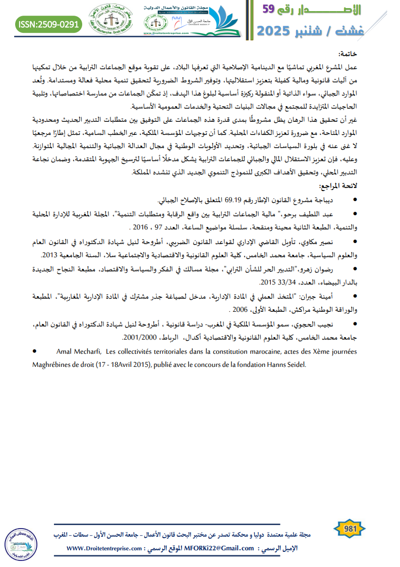 غير أن تحقيق هذا الرهان يظل مشروطًا بمدى قدرة هذه الجماعات على التوفيق بين متطلبات التدبير الحديث ومحدودية الموارد المتاحة، مع ضرورة تعزيز الكفاءات المحلية. كما أن توجيهات المؤسسة الملكية، عبر الخطب السامية، تمثل إطارًا مرجعيًا لا غنى عنه في بلورة السياسات الجبائية، وتحديد الأولويات الوطنية في مجال العدالة الجبائية والتنمية المجالية المتوازنة. وعليه، فإن تعزيز الاستقلال المالي والجبائي للجماعات الترابية يشكل مدخلًا أساسيًا لترسيخ الجهوية المتقدمة، وضمان نجاعة التدبير المحلي، وتحقيق الأهداف الكبرى للنموذج التنموي الجديد الذي تنشده المملكة.
