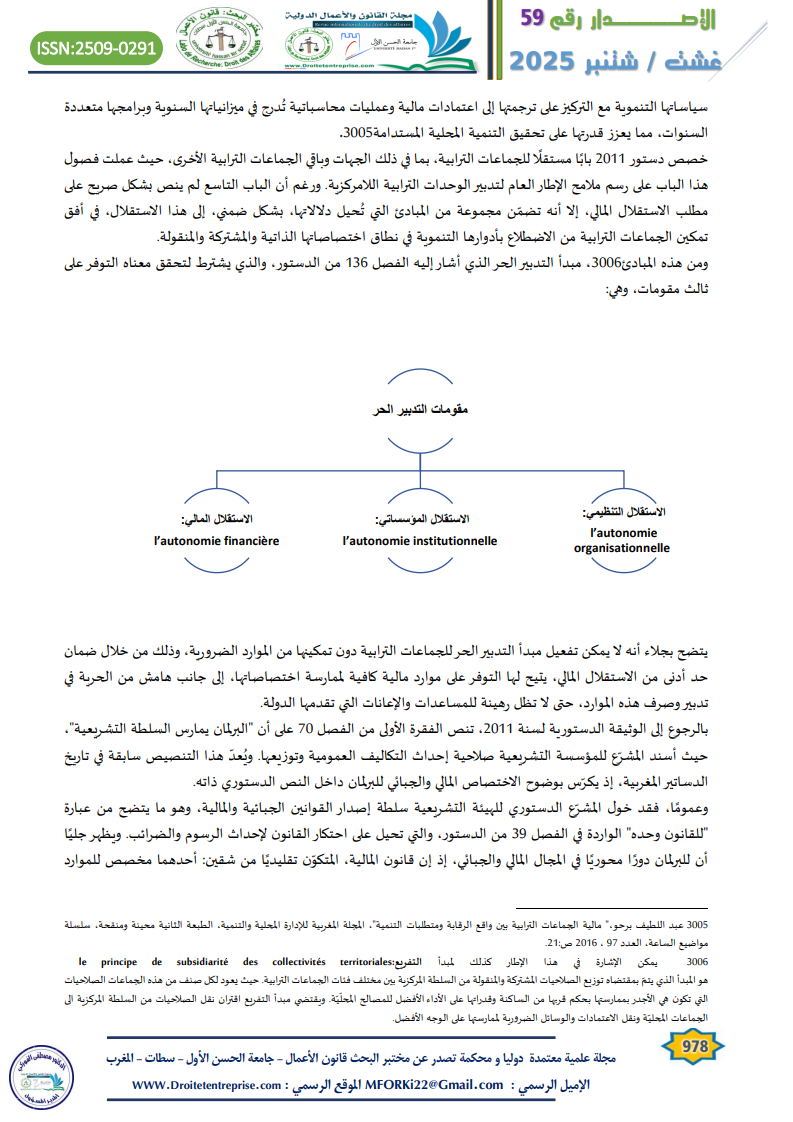 ومن هذه المبادئ، مبدأ التدبير الحر الذي أشار إليه الفصل 136 من الدستور، والذي يشترط لتحقق معناه التوفر على ثالث مقومات، وهي: