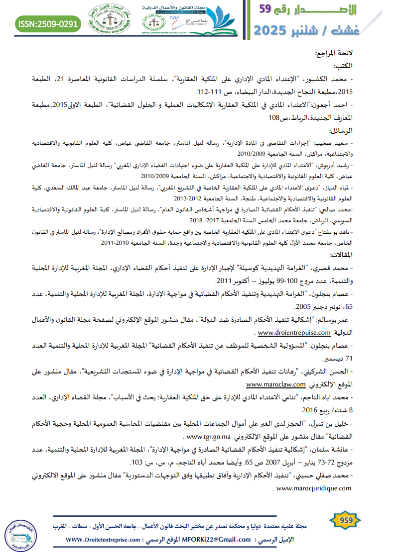 – محمد الكشبور، “الإعتداء المادي الإداري على الملكية العقارية”، سلسلة الدراسات القانونية المعاصرة 21، الطبعة 2015،مطبعة النجاح الجديدة،الدار البيضاء، ص 111-112.