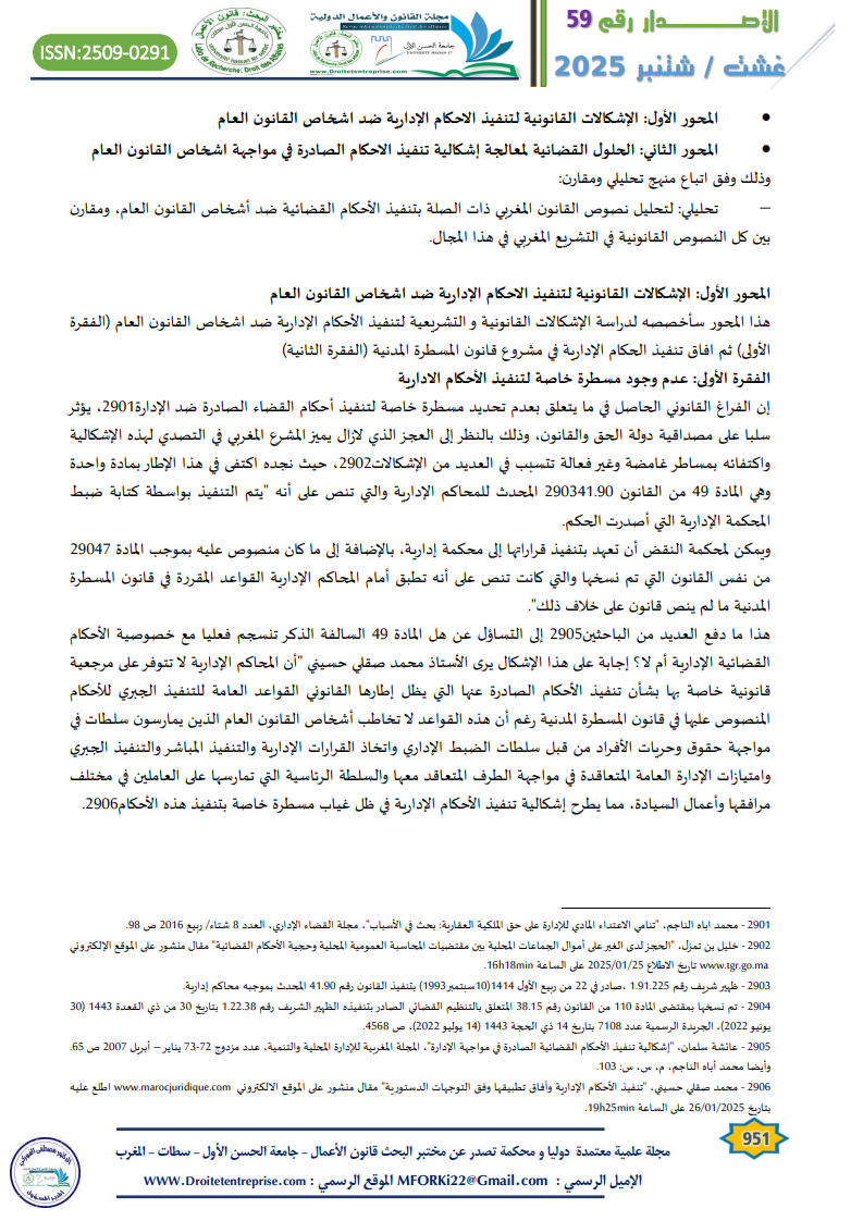 هذا المحور سأخصصه لدراسة الإشكالات القانونية و التشريعية لتنفيذ الأحكام الإدارية ضد اشخاص القانون العام (الفقرة الأولى) ثم افاق تنفيذ الحكام الإدارية في مشروع قانون المسطرة المدنية (الفقرة الثانية)