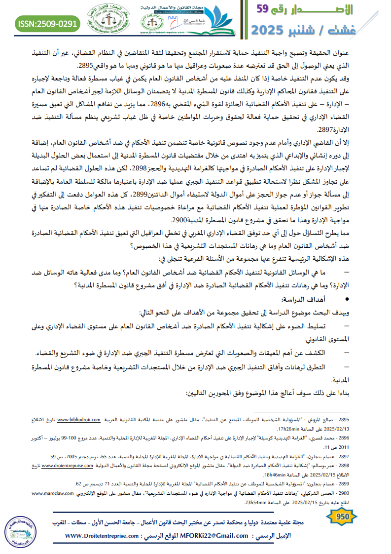 - الكشف عن أهم المعيقات والصعوبات التي تعترض مسطرة التنفيذ الجبري ضد الإدارة في ضوء التشريع والقضاء.