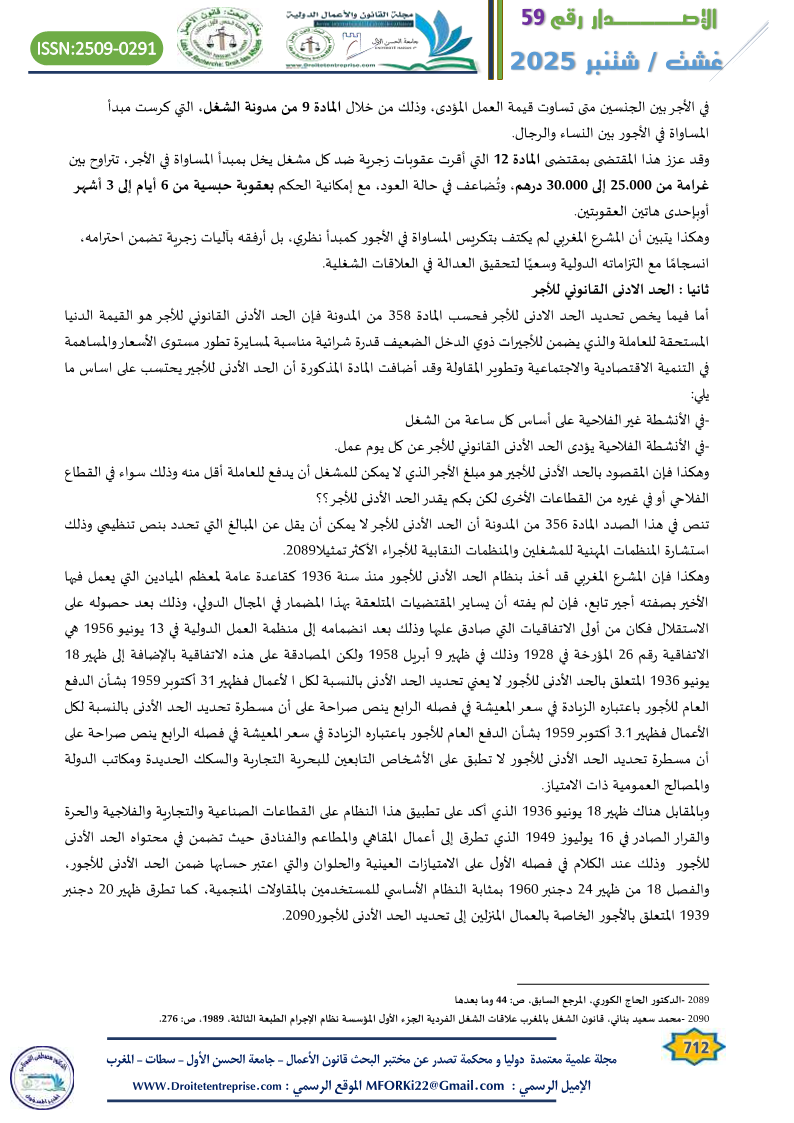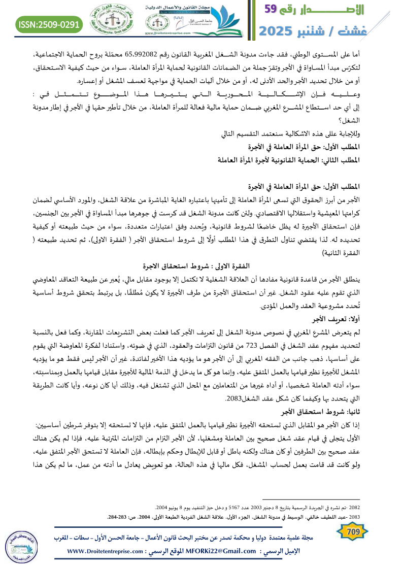 أما على المستوى الوطني، فقد جاءت مدونة الشغل المغربية القانون رقم 65.99 محمّلة بروح الحماية الاجتماعية، لتكرّس مبدأ المساواة في الأجر وتقرّ جملة من الضمانات القانونية لحماية المرأة العاملة، سواء من حيث كيفية الاستحقاق، أو من خلال تحديد الأجر والحد الأدنى له، أو من خلال آليات الحماية في مواجهة تعسف المشغل أو إعساره.