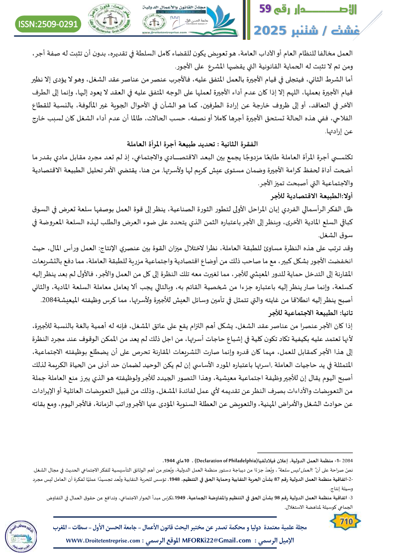 وفي هذا السياق، أصبح الأجر لا يُنظر إليه باعتباره مجرد مقابل لأداء الشغل، بل باعتباره حقًا جوهريًا له امتداداته الاجتماعية والاقتصادية، لاسيما بالنسبة للمرأة التي يُشكل الأجر غالبًا مصدر دخلها الوحيد، ووسيلة لضمان كرامتها واستقلاليتها. ومن هذا المنطلق، عملت التشريعات المقارنة، وكذا الاتفاقيات الدولية، وعلى رأسها اتفاقية منظمة العمل الدولية رقم 100، على تكريس مبدأ المساواة في الأجور، وربطته بعدم التمييز القائم على الجنس.