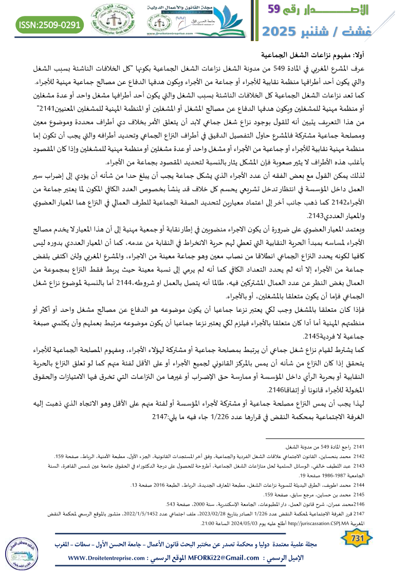 تعتبر نزاعات الشغل الجماعية من أهم المواضيع ذات الأهمية البالغة والتي تؤثر على الاستقرار والسلم الاجتماعيين وقد تخلق أثار سلبية على الحركة الاقتصادية والاستثمار مما ينعكس على فرص الشغل والتشغيل، مما ترتب عنه تدخل المشرع لوضع آليات ووسائل لتسوية وحل هذه النزاعات سواء عن طريق التصالح أو التحكيم أو وسائل أخرى بديلة كالوساطة. إلى أن طبيعة هذه النزاعات وما يصاحبها من قلاقل تهدد السلم الاجتماعي والاقتصادي تستدعي أحيانا تدخل القضاء في حدود معينة غايته الحفاظ على الحقوق الدستورية المتعارف عليها وضمان الشغل والإنتاج. الكلمات المفتاحية: نزاعات الشغل الجماعية – الخلافات – التفاوض الجماعي – تسوية النزاع – القضاء Abstract : Collective labor disputes are among the most important topics with significant importance that affect social stability and peace. They can create negative impacts on economic movement and investment, which in turn reflect on employment opportunities and job creation. Consequently, the legislator intervened to establish mechanisms and means for settling and resolving these disputes, whether through reconciliation, arbitration, or other alternative means such as mediation. However, the nature of these disputes and the accompanying anxiety threaten social and economic peace and sometimes require judicial intervention within certain limits. The goal of this intervention is to preserve the recognized constitutional rights and ensure employment and production. |