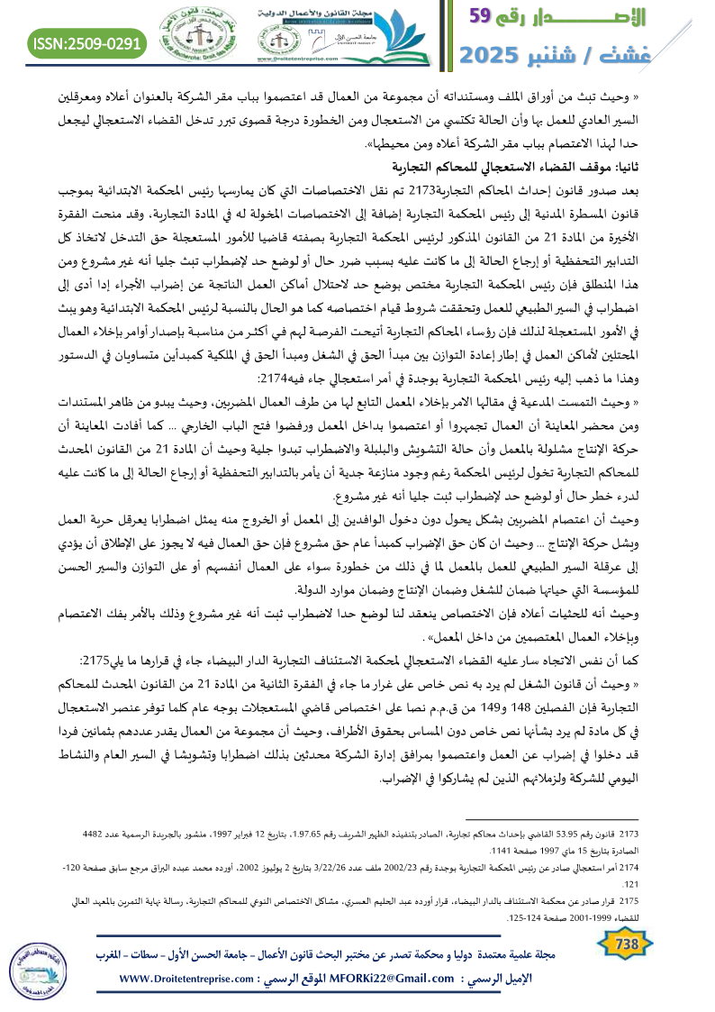 بعد صدور قانون إحداث المحاكم التجارية تم نقل الاختصاصات التي كان يمارسها رئيس المحكمة الابتدائية بموجب قانون المسطرة المدنية إلى رئيس المحكمة التجارية إضافة إلى الاختصاصات المخولة له في المادة التجارية، وقد منحت الفقرة الأخيرة من المادة 21 من القانون المذكور لرئيس المحكمة التجارية بصفته قاضيا للأمور المستعجلة حق التدخل لاتخاذ كل التدابير التحفظية أو إرجاع الحالة إلى ما كانت عليه بسبب ضرر حال أو لوضع حد لإضطراب تبث جليا أنه غير مشروع ومن هذا المنطلق فإن رئيس المحكمة التجارية مختص بوضع حد لاحتلال أماكن العمل الناتجة عن إضراب الأجراء إدا أدى إلى اضطراب في السير الطبيعي للعمل وتحققت شروط قيام اختصاصه كما هو الحال بالنسبة لرئيس المحكمة الابتدائية وهو يبث في الأمور المستعجلة لذلك فإن رؤساء المحاكم التجارية أتيحـــت الفرصـــة لهم فــــي أكثــــر مـــن مناسبـــة بإصدار أوامر بإخلاء العمال المحتلين لأماكن العمل في إطار إعادة التوازن بين مبدأ الحق في الشغل ومبدأ الحق في الملكية كمبدأين متساويان في الدستور وهذا ما ذهب إليه رئيس المحكمة التجارية بوجدة في أمر استعجالي جاء فيه: