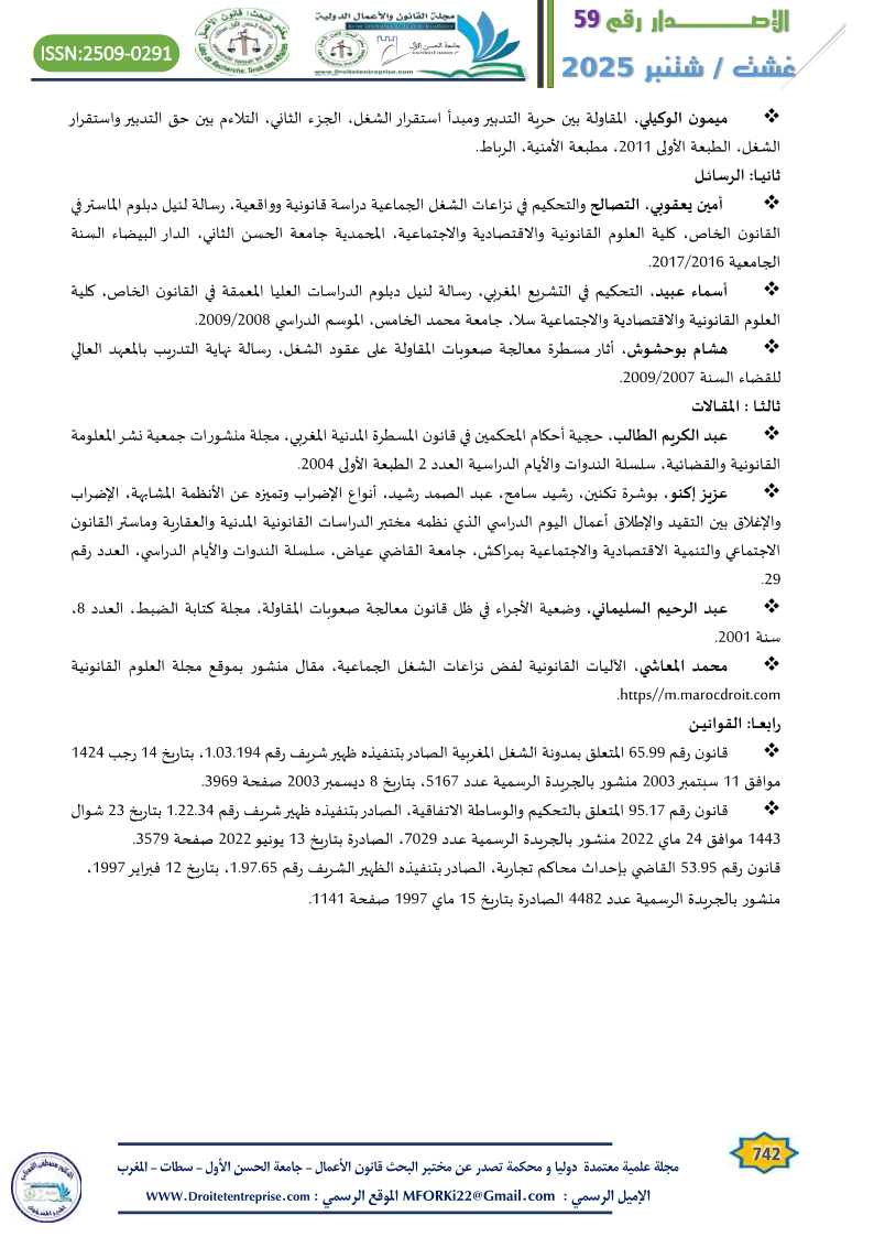 أمين يعقوبي، التصالح والتحكيم في نزاعات الشغل الجماعية دراسة قانونية وواقعية، رسالة لنيل دبلوم الماستر في القانون الخاص، كلية العلوم القانونية والاقتصادية والاجتماعية، المحمدية جامعة الحسن الثاني، الدار البيضاء السنة الجامعية 2016/2017.