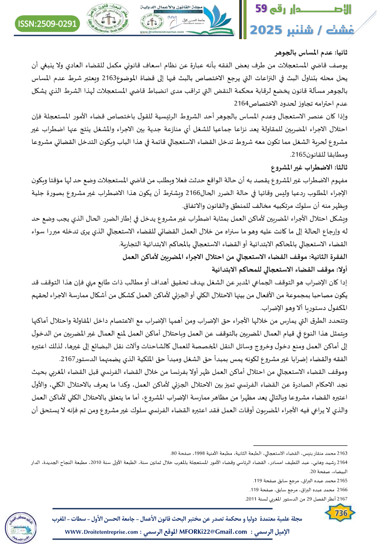 كما هو معلوم فإن القضاء الاستعجالي يتدخل كلما كان هناك عنصر الاستعجال لدرء خطر حال ووجود منازعة جدية وعدم المساس بالجوهر لذلك فإن القضاء الاستعجالي يرى أنه مختصا للتدخل في نزاع شغل جماعي مصحوب بإضراب إدا ثبت جليا أنه غير مشروع وتتجلى شروط تدخله في مدى توافر العناصر التالية: