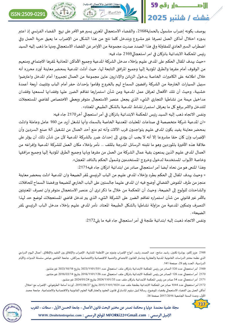 » وحيث أن قانون الشغل لم يرد به نص خاص على غرار ما جاء في الفقرة الثانية من المادة 21 من القانون المحدث للمحاكم التجارية فإن الفصلين 148 و149 من ق.م.م نصا على اختصاص قاضي المستعجلات بوجه عام كلما توفر عنصر الاستعجال في كل مادة لم يرد بشأنها نص خاص دون المساس بحقوق الأطراف، وحيث أن مجموعة من العمال يقدر عددهم بثمانين فردا قد دخلوا في إضراب عن العمل واعتصموا بمرافق إدارة الشركة محدثين بذلك اضطرابا وتشويشا في السير العام والنشاط اليومي للشركة ولزملائهم الذين لم يشاركوا في الإضراب.